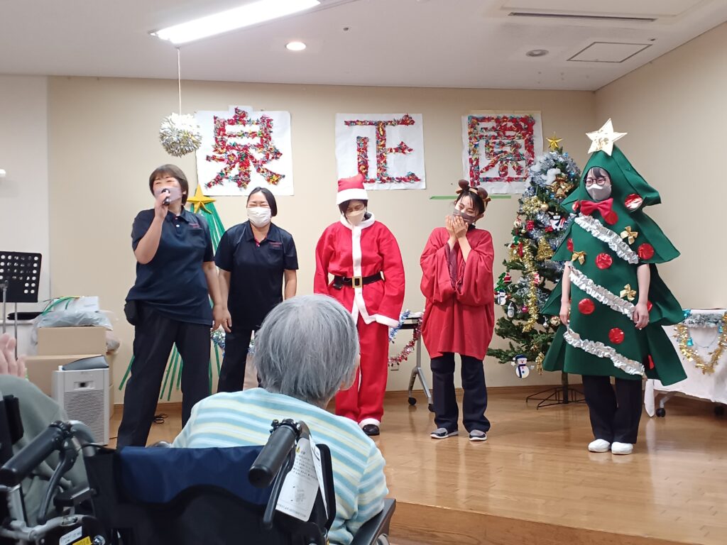 サンタやトナカイ、もみの木に扮した職員にご利用者様の笑顔が弾けていました。