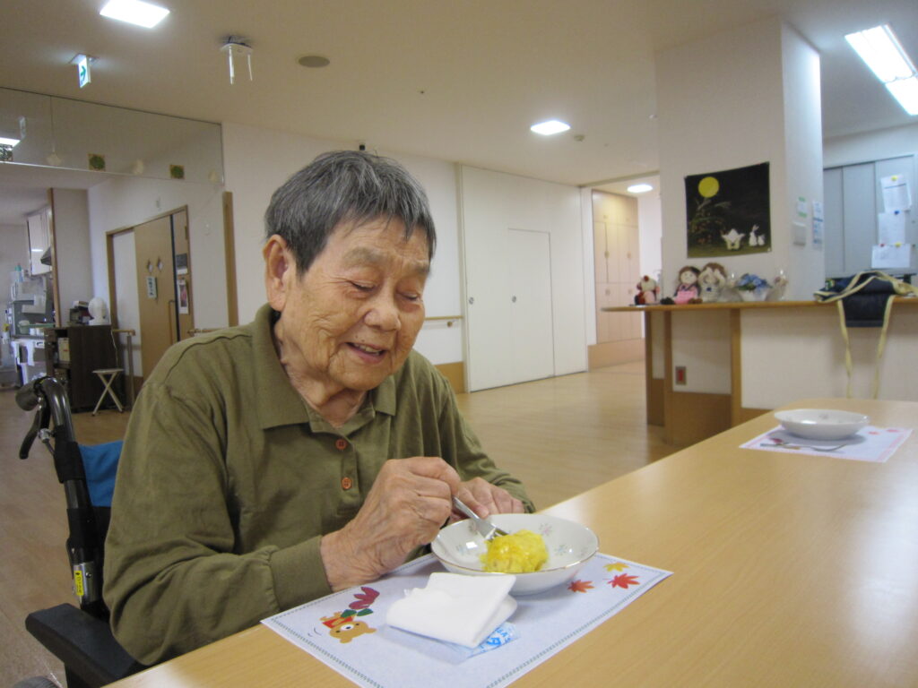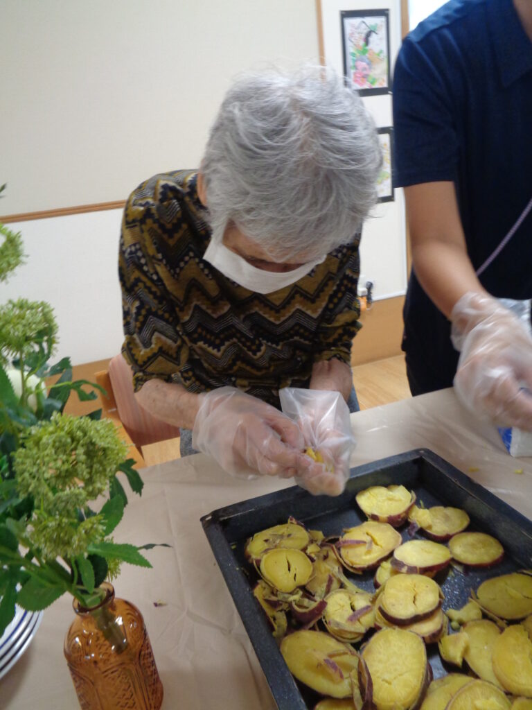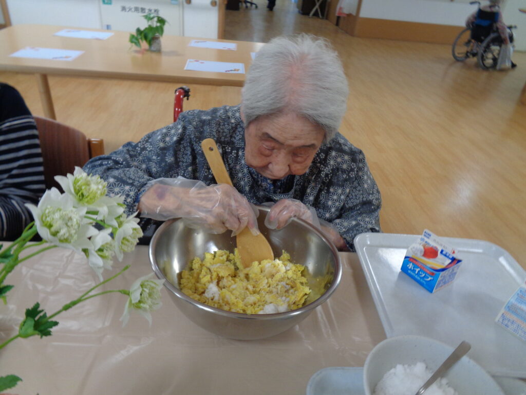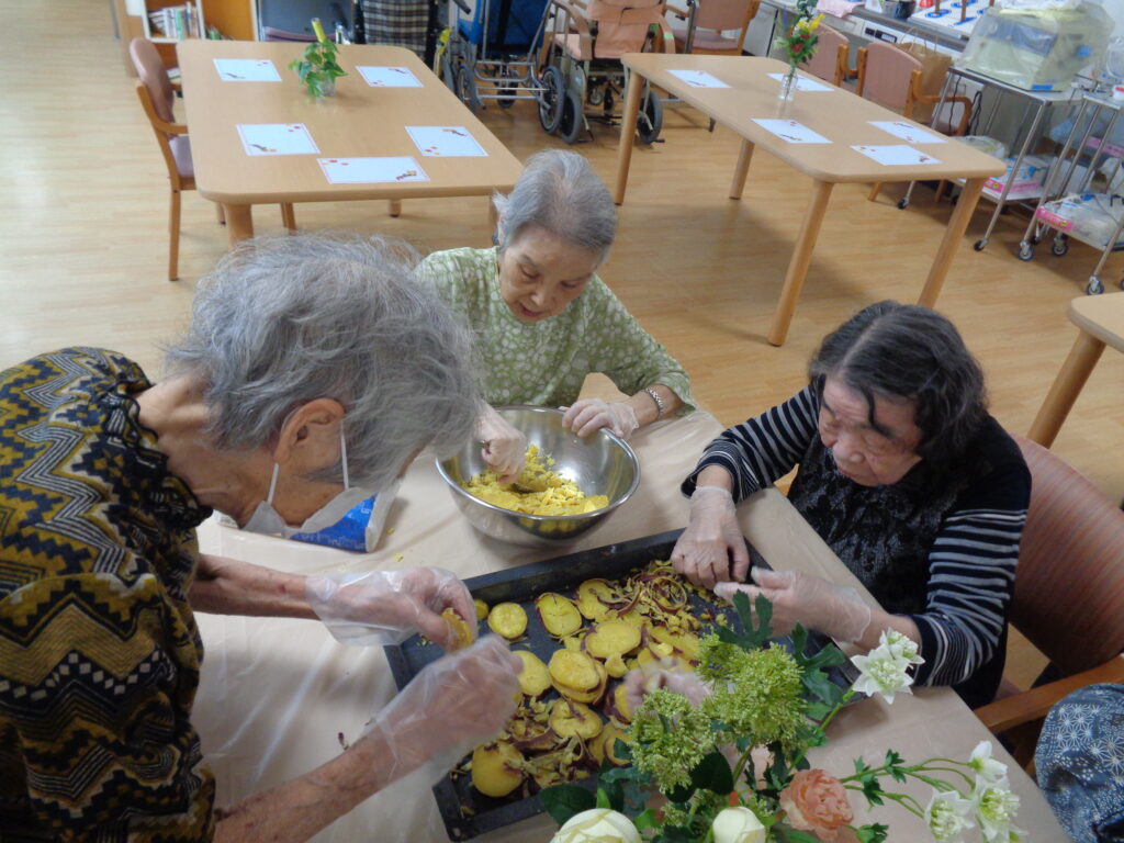 お芋の皮を取って潰し、マーガリンと砂糖を入れて混ぜます👩‍🍳