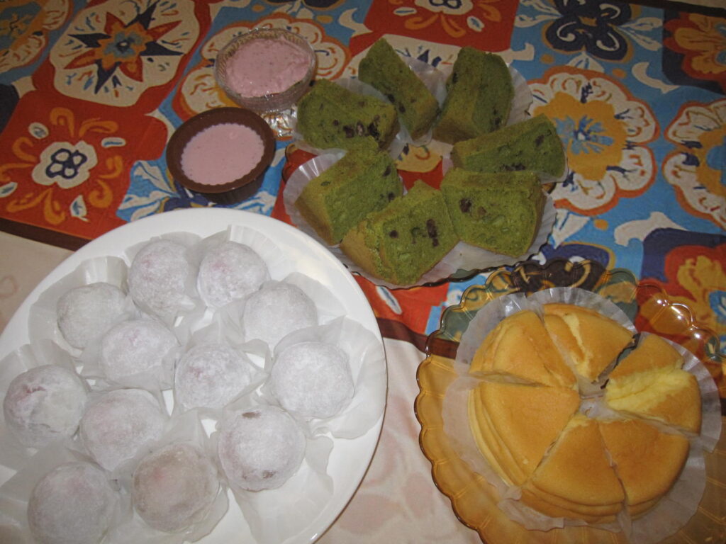 本日のメニューは【苺大福・抹茶シフォンケーキ・スフレチーズケーキ】です😋